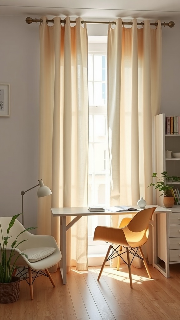Translucent window panels are a stylish choice for modern home offices. These curtains allow natural light to filter through while still providing a level of privacy. In the image above, we see a bright, airy office space enhanced by long, light-colored curtains that extend from the ceiling to the floor.