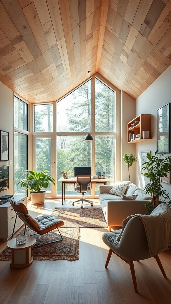The image showcases a stunning home office with a high, wooden ceiling and large windows that let in plenty of natural light. The combination of light colors and rustic wooden elements creates a welcoming atmosphere.